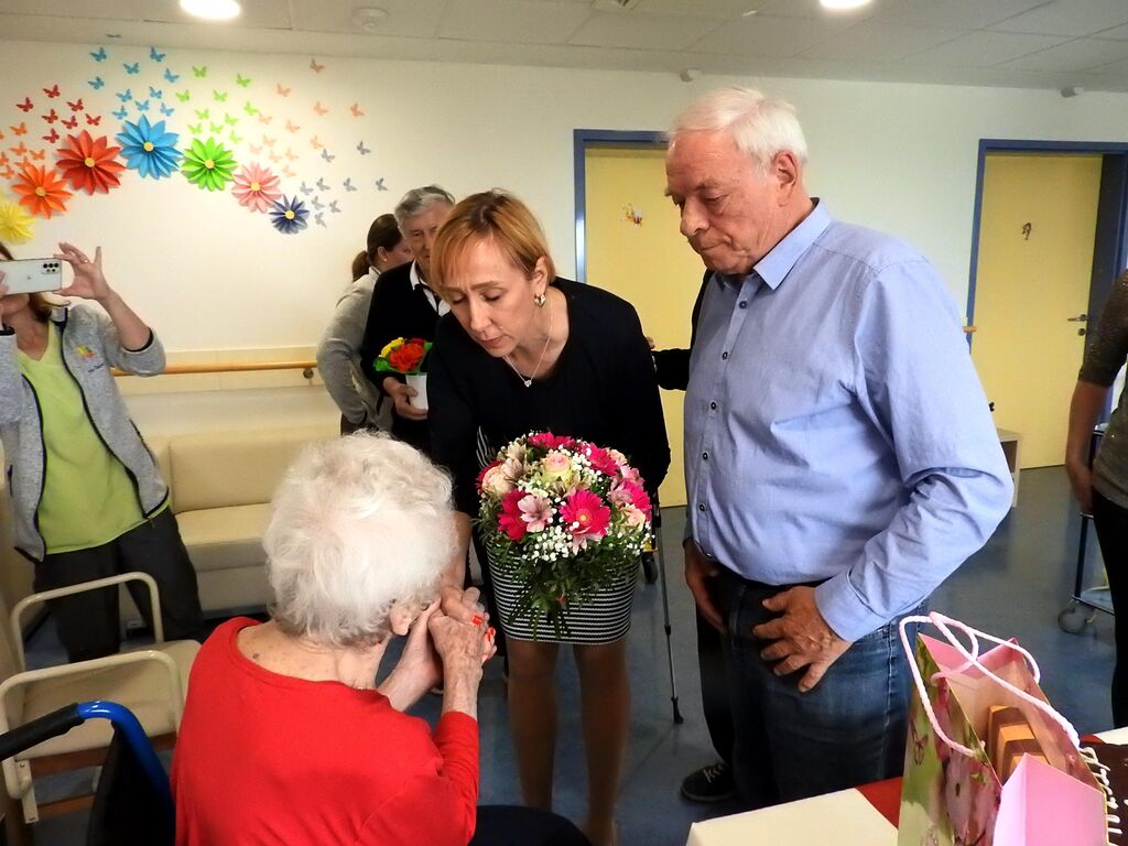 DSCN 4538 Slavljenki so čestitali za 101 rojstni dan sorodniki, (prva z leve) direktorica Doma Taber Martina Martinčič in (drugi z leve) župan Občine Cerklje Franc Čebulj