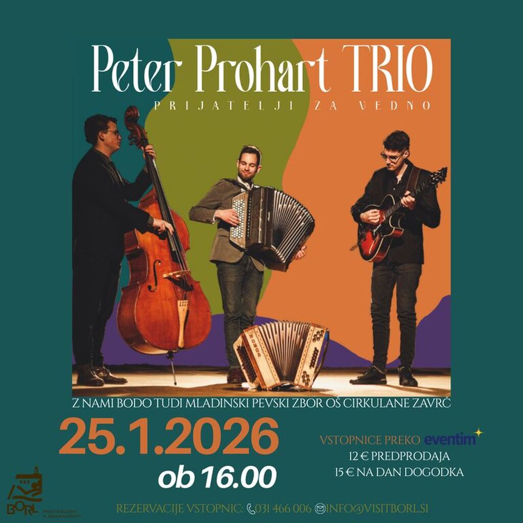 Peter Prohart Trio združuje vrhunske glasbenike, ki z iskreno ljubeznijo do slovenske narodnozabavne glasbe ustvarjajo toplino, domačnost in pravo praznično vzdušje. Njihove melodije bodo v na začetku leta 2026 zazvenele v edinstvenem ambientu viteške dvorane gradu Borl ter večeru vdihnile poseben čar in občutek povezanosti tradicije, glasbe in grajskega prostora.