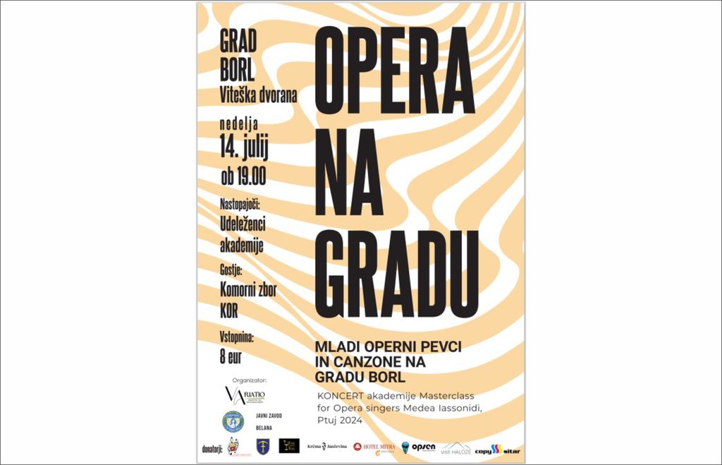 V nedeljo, 14, julija ob 19. uri bo na gradu Borl dogodek v seriji koncertov Opera na gradu. Zazvenele bodo napolitanske pesmi (canzone) v izvedbi mladih opernih pevcev iz Slovenije in tujine, ki se bodo v tednu do koncerta intenzivno izpopolnjevali na opernem masterclassu z Medeo Iassonidi na Ptuju.