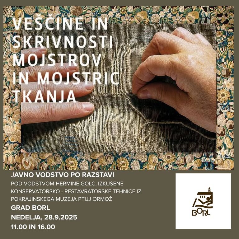 Javno vodstvo po razstavi VEŠČINE IN SKRIVNOSTI MOJSTROV IN MOJSTRIC TKANJA (vodstvo bo imela Hermina Golc, soavtorica razstave in izkušena konzervatorsko - restavratorsko tehnica Pokrajinskega muzeja Ptuj Ormož), nedelja, 28.9.2025 ob 11.00 in 16.00.
