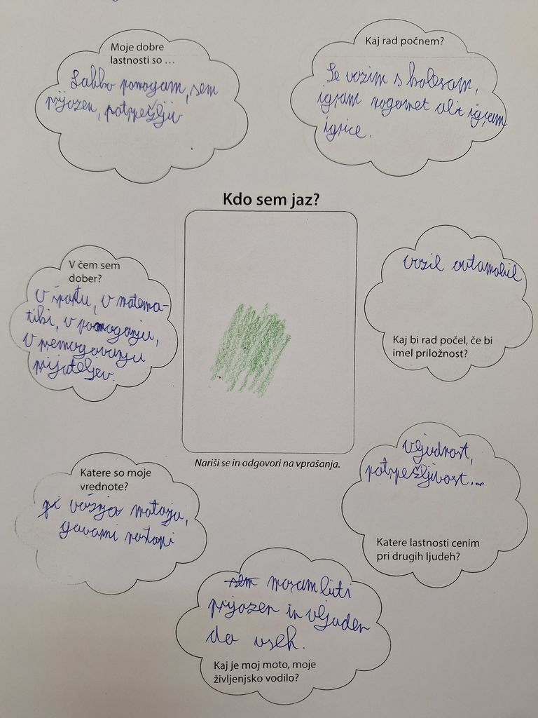 Z učenci 7. razredov smo izvedli še delavnico – socialno igro z naslovom »Kdo sem jaz?« Tako so v dobri luči predstavili sebe in dali besedo tudi sošolcu, ki je o svojem vrstniku lahko še kakšno dobro lastnost dodal. Učenci so prišli do spoznanja, da je o sebi zelo težko govoriti in tudi težko najti dobre lastnosti. Pri marsikaterem sošolcu so njegovi vrstniki našli več pozitivnih, dobrih lastnosti kot on sam.