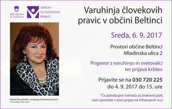 Varuhinja človekovih pravic Vlasta Nussdorfer bo v sredo, 6.9.2017, s sodelavci poslovala v prostorih občine Beltinci.