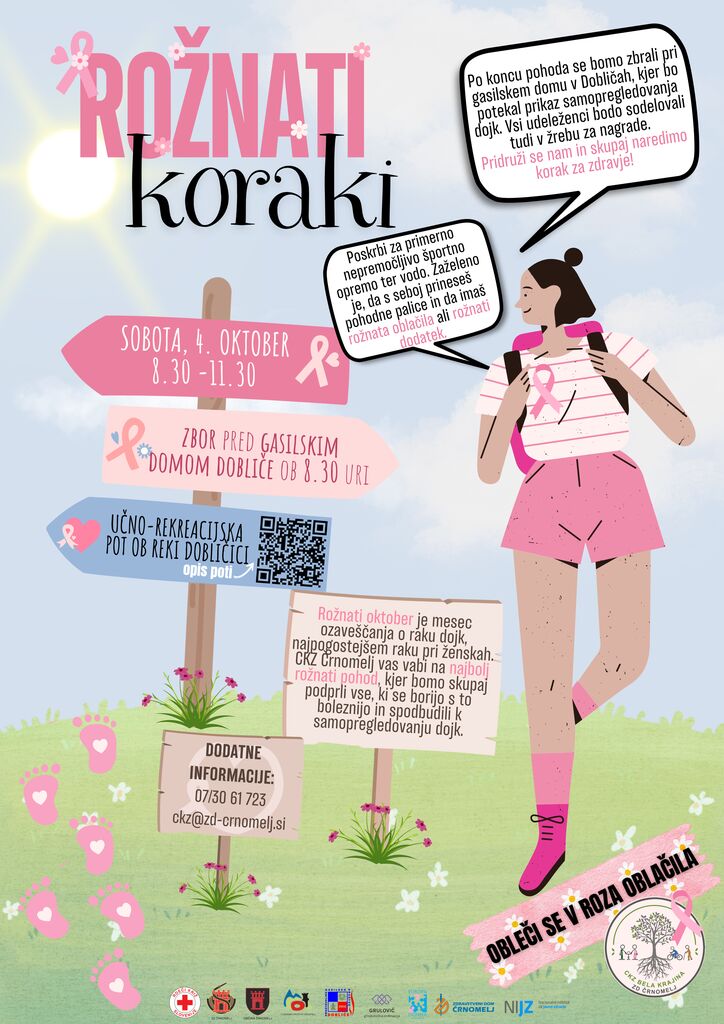 Rožnati koraki bodo potekali v soboto, 4. oktobra 2025 od 8.30 do 11.30 ure v učno-rekreacijski poti ob reki Dobličici. Zbor je ob 8.30 uri pred Gasilskim domom Dobliče.