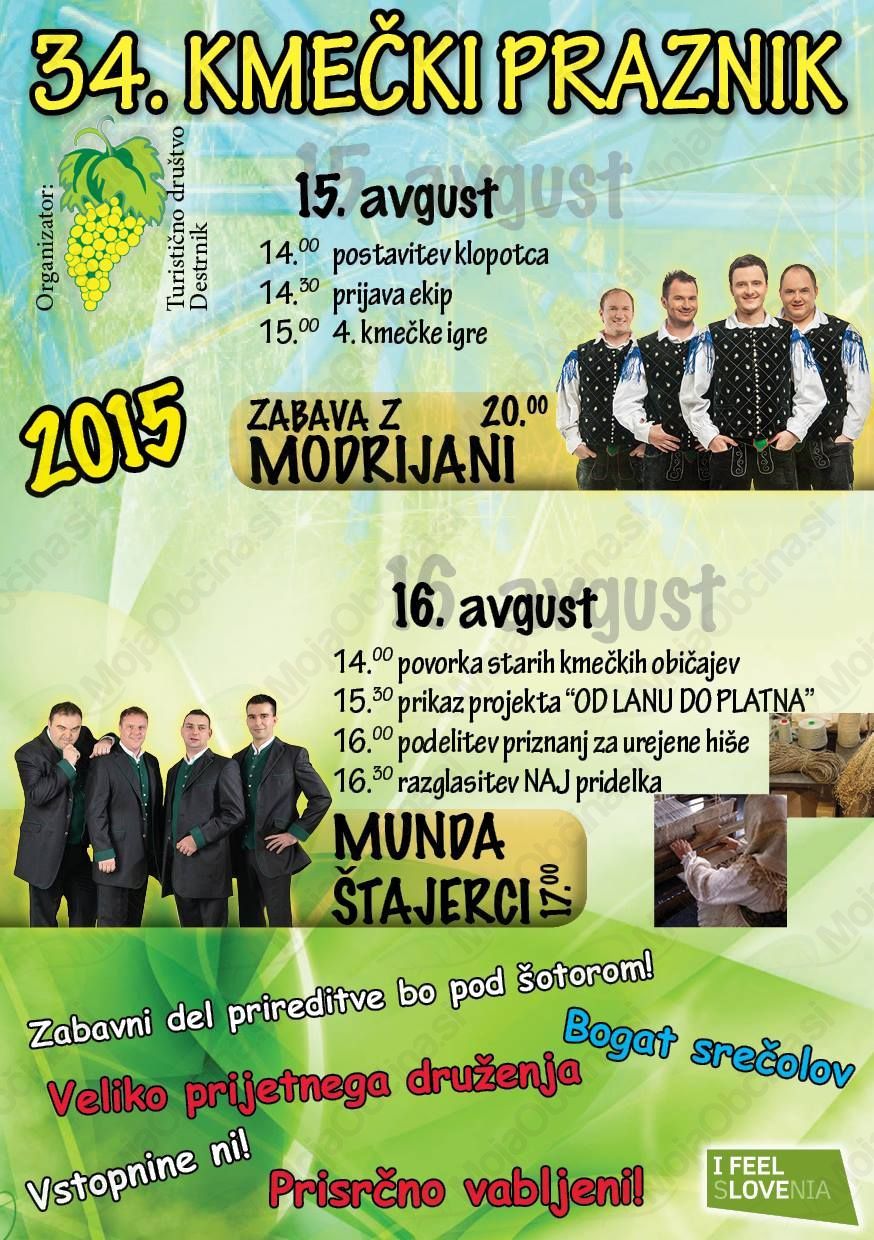 15. in 16. avgusta bo v Destrniku potekal 34. kmečki praznik, na katerem se boste zabavali z Modrijani in Munda Štajerci. Vstopnine ni.
