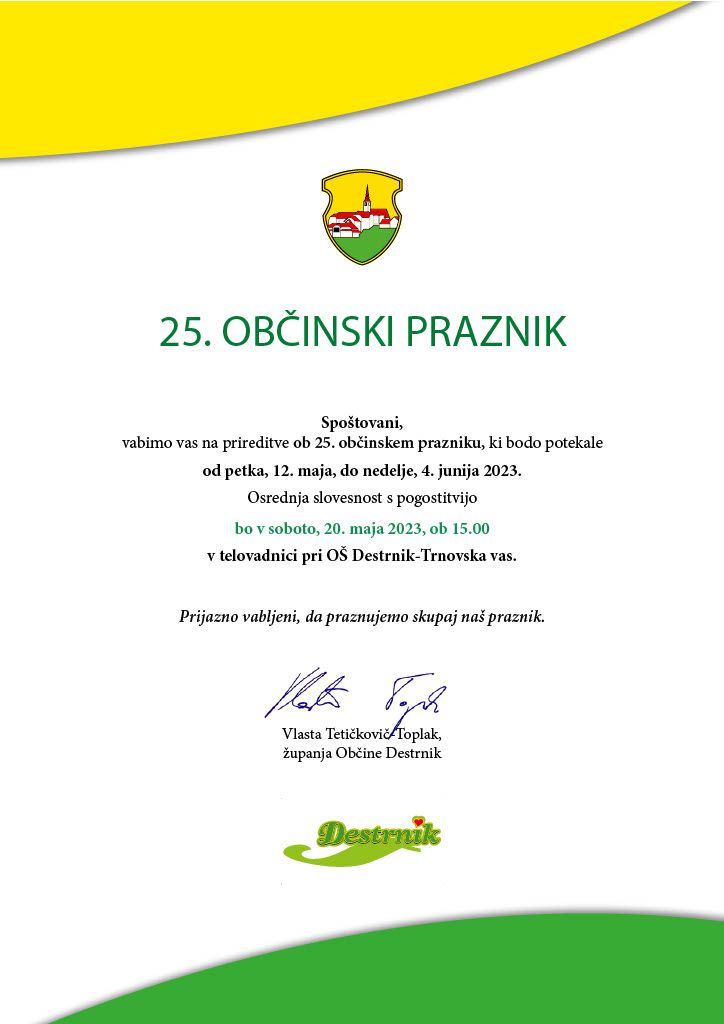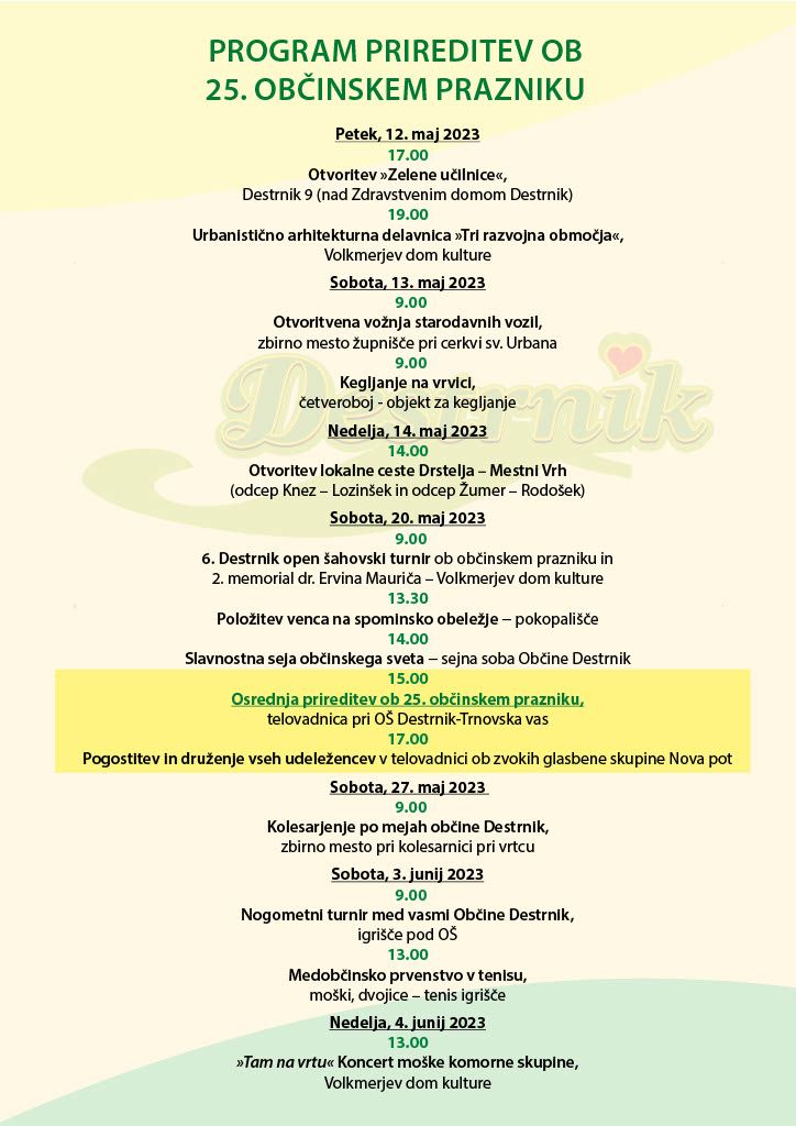 Osrednja slovesnost s pogostitvijo bo v soboto, 20. maja 2023, ob 15. uri v telovadnici pri OŠ Destrnik-Trnovska vas.