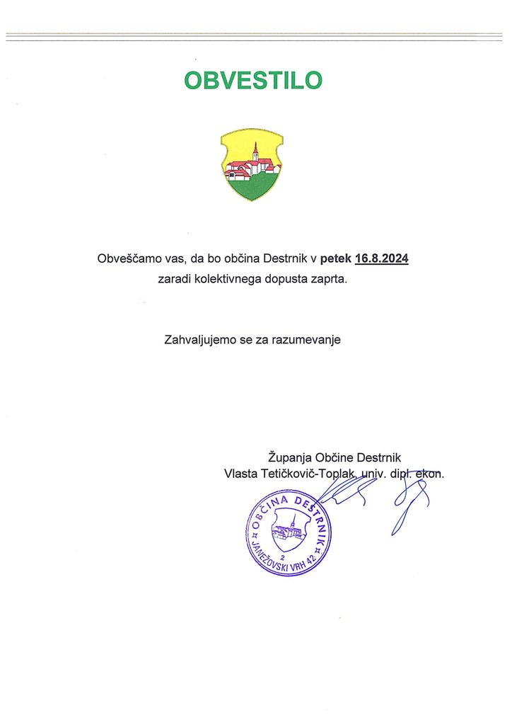 OBVESTILO - OBČINA BO V PETEK 16. 8. 2024 ZAPRTA