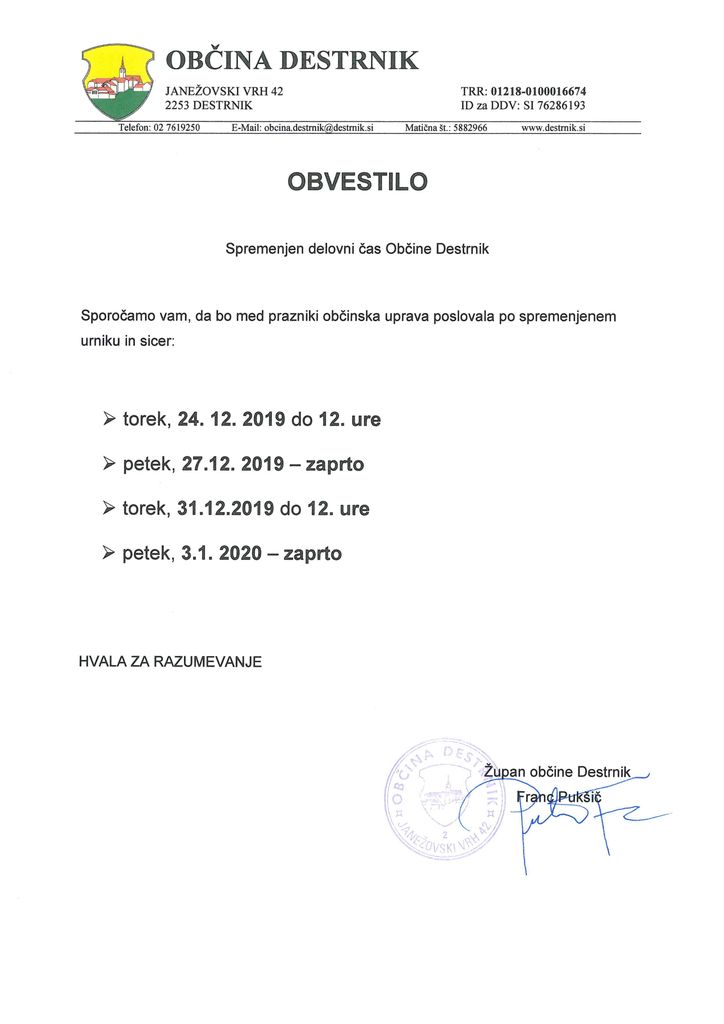 OBVESTILO: spremenjen delovni čas občinske uprave Občine Destrnik v času praznikov