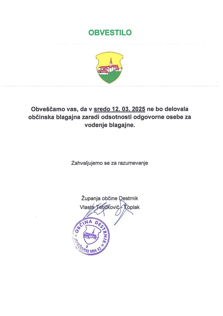 OBVESTILO O NEDELOVANJU OBČINSKE BLAGAJNE 12.3.2025