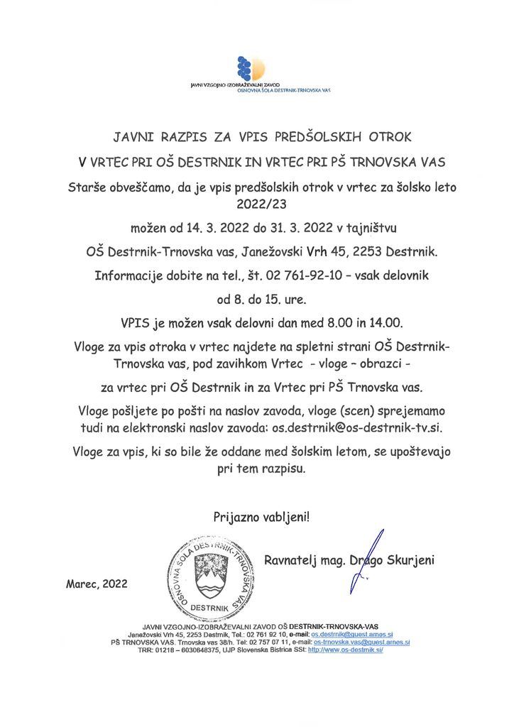 JAVNI RAZPIS ZA VPIS PREDŠOLSKIH OTROK V VRTEC PRI OŠ DESTRNIK IN PŠ TRNOVSKA VAS 2022/23