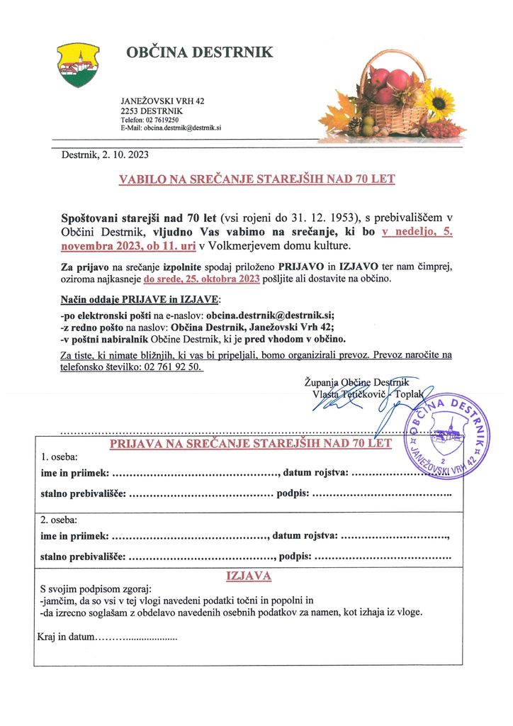Vabljeni vsi starejši stari 70 (vsi rojeni do 31.12.1953) in več let na tradicionalno srečanje starejših našega kraja, ki bo v nedeljo 5. novembra 2023 ob 11. uri v Volkmerjevem domu kulture. Prijave so obvezne. Podrobnosti in prijava na srečanje v priloženem vabilu.