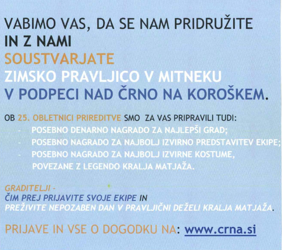 v Črni je vse pripravljeno za 25. Gradove kralja Matjaža. Vabimo vse graditelje, da se nam pridružite in nam pomagate soustvarjati snežno pravljico v zimskem raju. Prijavite se lahko tukaj:  http://www.crna.si/gradovi_obrazec/ . Čakajo vas lepe nagrade in zanimiv program zato si rezervirajte zadnji vikend v januarju za nepozabno zabavo pod Peco!