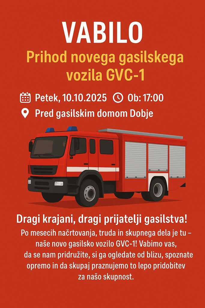 Dragi krajani, donatorji in prijatelji gasilstva – vabljeni, da se skupaj razveselimo prihoda našega novega gasilskega vozila GVC-1 ta petek ob 17:00 uri pred gasilskim domom v Dobju!