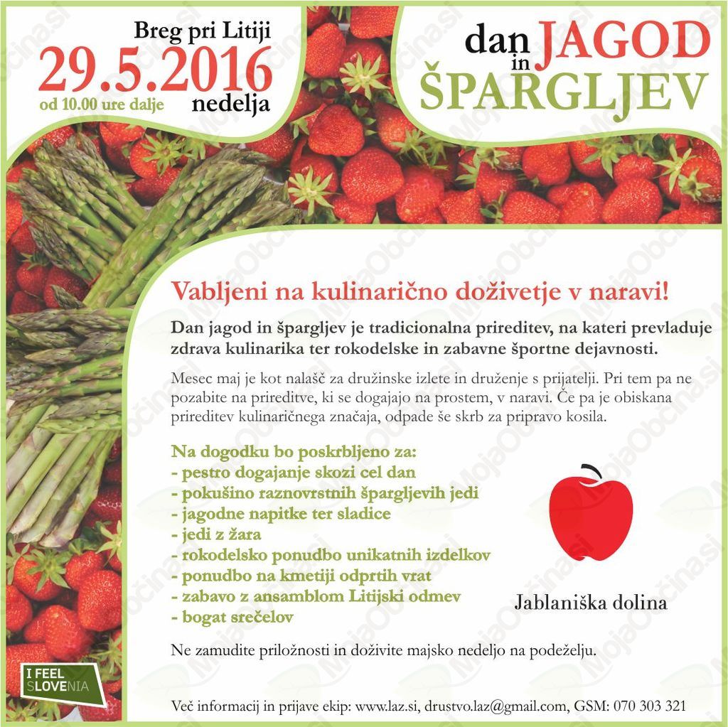 V nedeljo 29. maja boste lahko od 10. ure dalje uživali na Dnevu jagod in špargljev, ki ga Društvo Laz organizira na Bregu pri Litiji. Pestra ponudba dobrot iz jagod in špargljev, rokodelski izdelki ter zabava za vso družino so najboljši razlogi za obisk. Se vidimo!