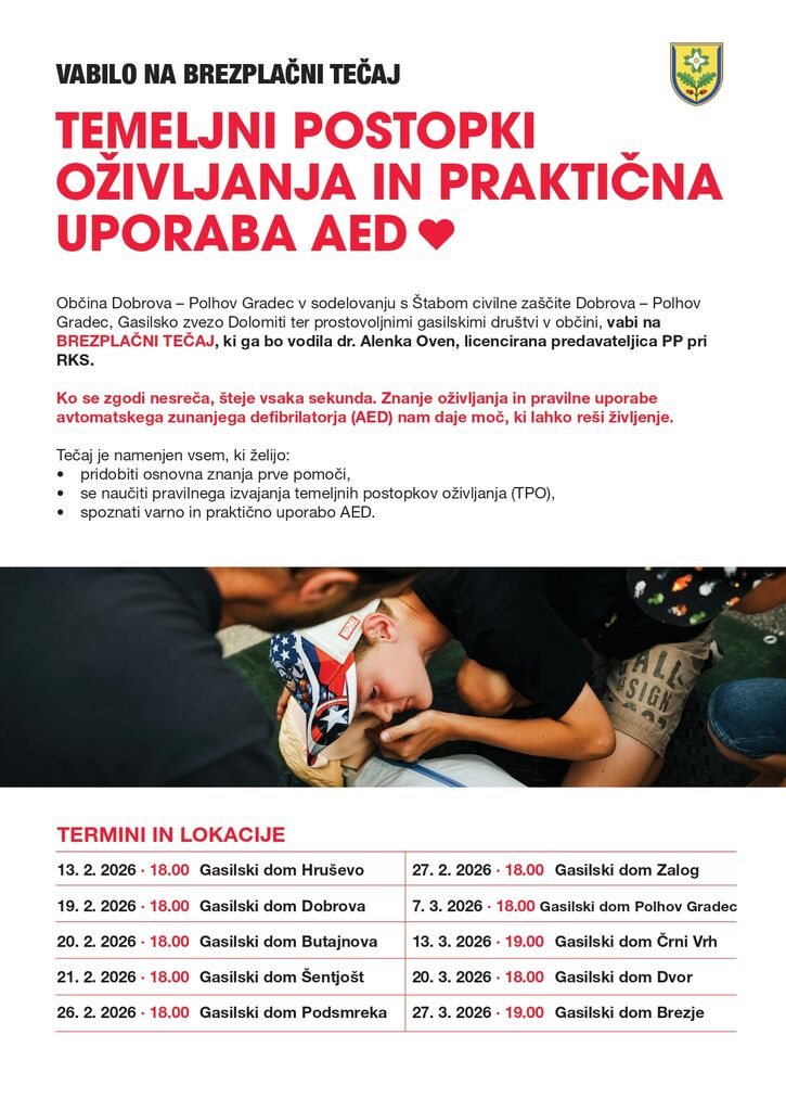 Občina Dobrova – Polhov Gradec v sodelovanju s Štabom civilne zaščite Dobrova – Polhov Gradec, Gasilsko zvezo Dolomiti ter prostovoljnimi gasilskimi društvi v občini vabi občanke in občane na brezplačne tečaje temeljnih postopkov oživljanja ter praktične uporabe avtomatskega zunanjega defibrilatorja (AED).
