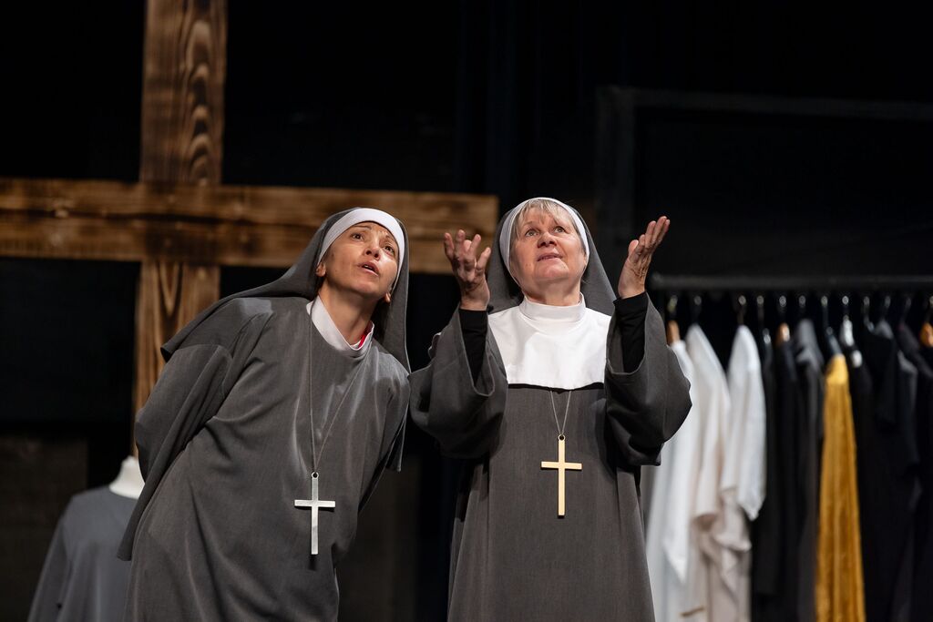 Skrivnosti, lažne identitete in romance bodo v tej farsi sunkovitih zapletov sprožile veliko smeha. Novinarjema Pavlu in Silviji se ponudi izjemna priložnost, ki jima obeta hiter skok po karierni lestvici. Njuna naloga je izslediti zmagovalca vinskega tekmovanja, kar ju pripelje do samostana sester Reda večnega šivanja. V iskanju resnice in slave je odločna Silvija pripravljena storiti vse, previdnejši Pavel pa išče nekaj povsem drugega…Pod krinko se nastanita v samostanu, njuna prisotnost pa skupaj s prihodom nove sestre v Redu večnega šivanja povzroči paranojo, da so med njimi iz Rima poslani vohuni z namenom, da jih zaprejo.