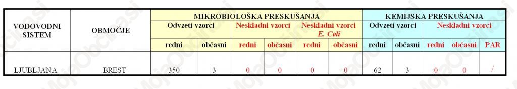 Skladno s Pravilnikom o pitni vodi (Ur. l. RS 19/04, 35/04, 26/06, 92/06, 25/09) smo pripravili letno poročilo o skladnosti pitne vode za leto 2012, ki je objavljeno na spletni strani www.vo-ka.si v rubriki Informacije/Kakšno vodo pijemo/Letno poročilo o skladnosti pitne vode. Povzetek poročila se nahaja v preglednici, ki prikazuje število odvzetih in neskladnih vzorcev v okviru notranjega nadzora za mikrobiološka in fizikalno-kemijska preizkušanja za oskrbovalno območje Brest.