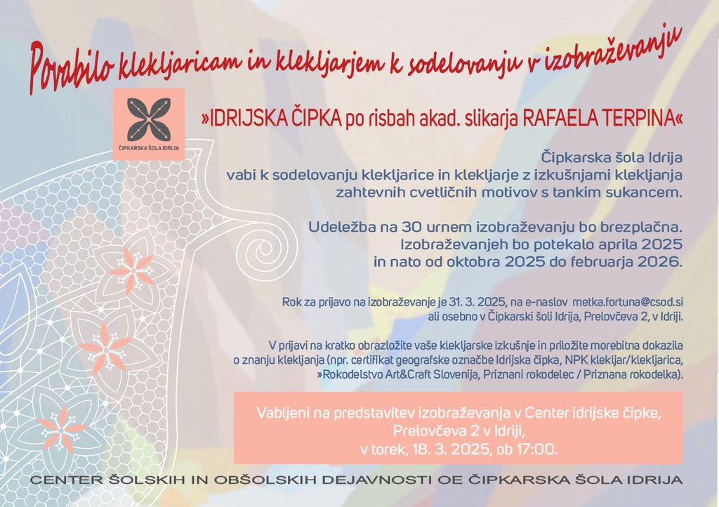 Čipkarska šola Idrija vabi izkušene klekljarice in klekljarje k sodelovanju v izobraževanju z naslovom Idrijska čipka po risbah akad. slikarja Rafaela Terpina. Program je namenjen tistim, ki obvladajo zahtevne cvetlične motive s tankim sukancem. Izobraževanje v obsegu 30 ur bo brezplačno in bo potekalo aprila 2025 ter nadaljevalo od oktobra 2025 do februarja 2026.