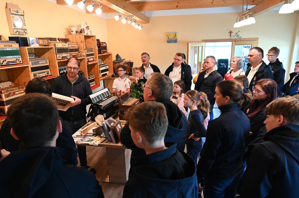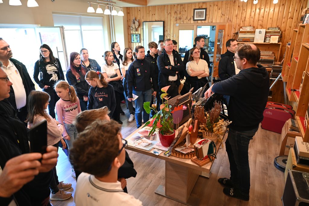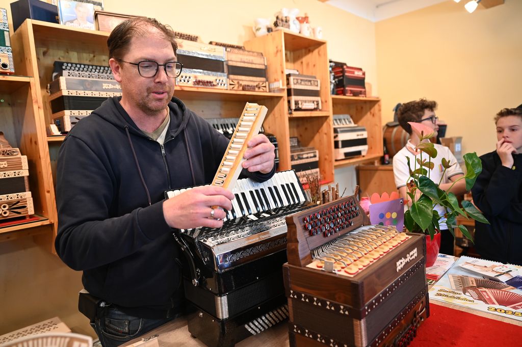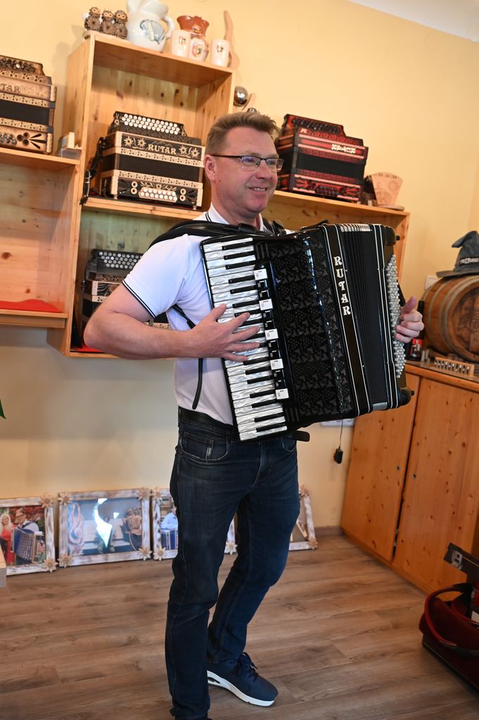 sprejel gospod Aleks Rutar, sin pokojnega Jožkota Rutarja, začetnika harmonik Rutar.