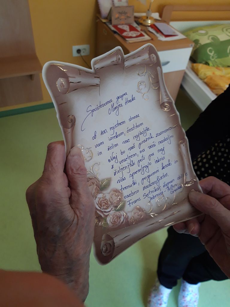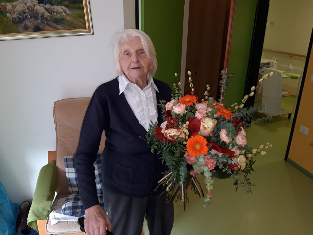 Ob tej priložnosti so ji zaposleni Doma upokojencev Franc Salomon, enota Prebold, v imenu župana Franca Setnikarja predali šopek cvetja ter čestitke in ji zaželeli vse najboljše ob njenem visokem jubileju.