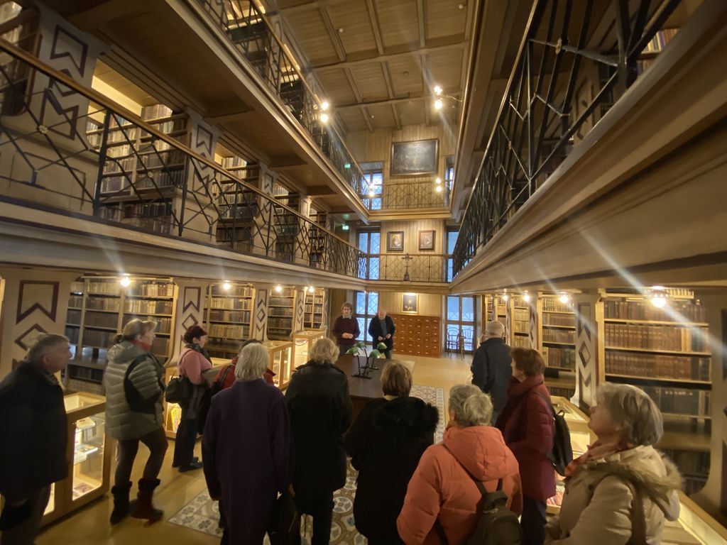 In nato smo vstopili tudi v znamenito, slikovito in pravkar obnovljeno knjižnico. Fond knjig je izjemno obsežen in treba bo še veliko energije in časa, da bodo vse knjige popisali v digitalni seznam Cobiss, saj bo šele tako jasna slika, kakšno zgodovinsko in kulturno bogastvo predstavlja knjižni fond Frančiškanske knjižnice z več kot sedemstoletno zgodovino v Ljubljani. Po silovitem ljubljanskem potresu 1896 leta so knjižnico preselili v prostore današnjega samostana na Prešernovem trgu.