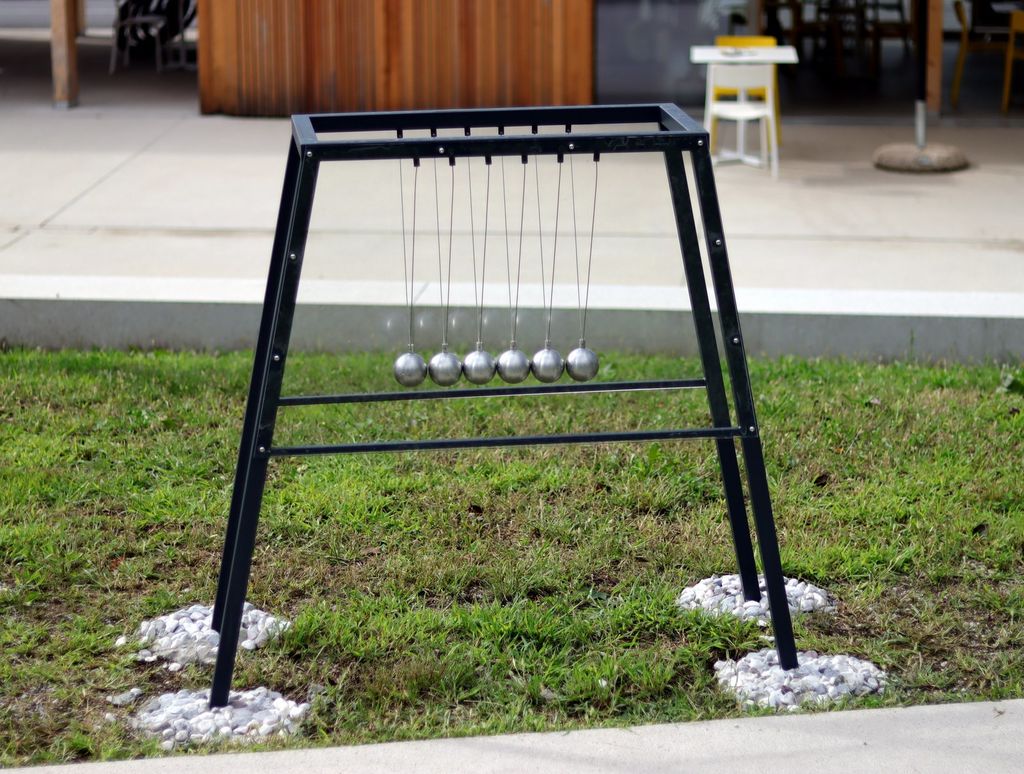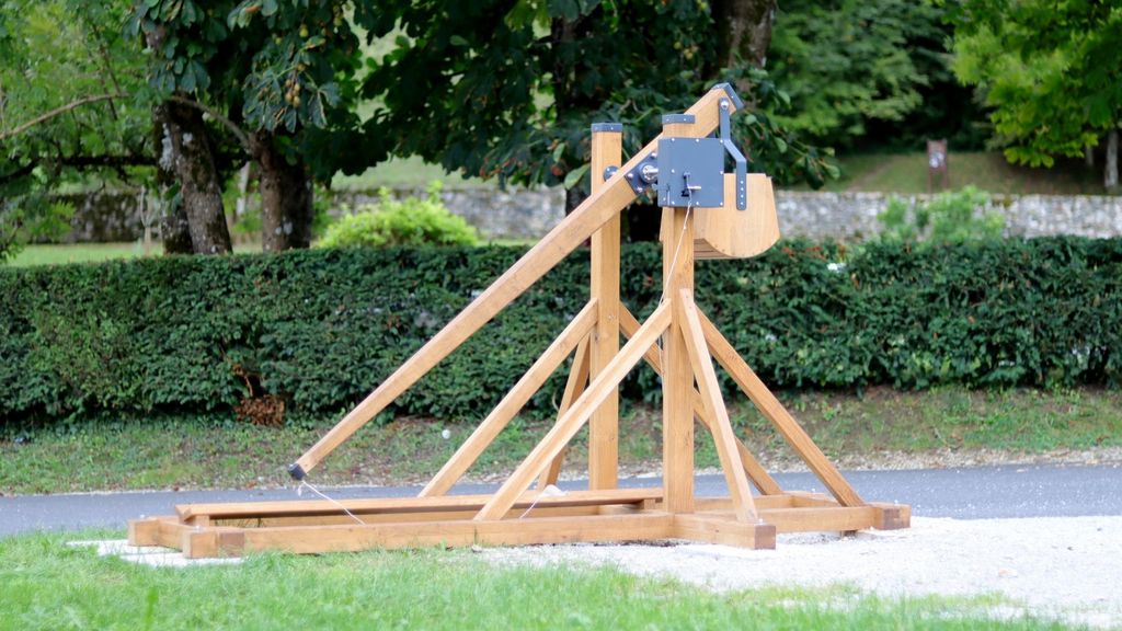 In ko nekateri igramo tarok ali biljard, so se lokalni intelektualci spravili k res veliki igrači, ki stoji nasproti grajskega parka. Gre za glavno topniško orožje pred izumom smodnika in topa do srednjega veka – tribok (trebuchet po francosko) je mehanska metalna naprava, ki je bila v uporabi od 4. stoletja pred našim štetjem pa do iznajdbe topov v 15. stoletju. Prvi so ga uporabljali Kiitajci, v Evropo je prišel šele okrog leta 1.200, saj so v Evropi že v prvem tisočletju za obleganja uporabljali enostavnejši katapult, ki deluje z vzmetmi, podobno kot lok. Tribok je konstrukcijsko zahtevnejši od katapulta in deluje s pretvarjanjem potencialne energije uteži v kinetično energijo izstrelka. Gibljiva utež se nahaja na krajši ročici od vrtišča, na petkrat daljši ročici pa je pritrjena vrv z držalom za izstrelek, ki je lahko poletel do 200 m daleč! Največkrat kamenje, a so med obleganji mest za obzidji izstreljevali tudi kose kužnih trupel ali pa človeško blato in s tem sejali smrt in bolezni.