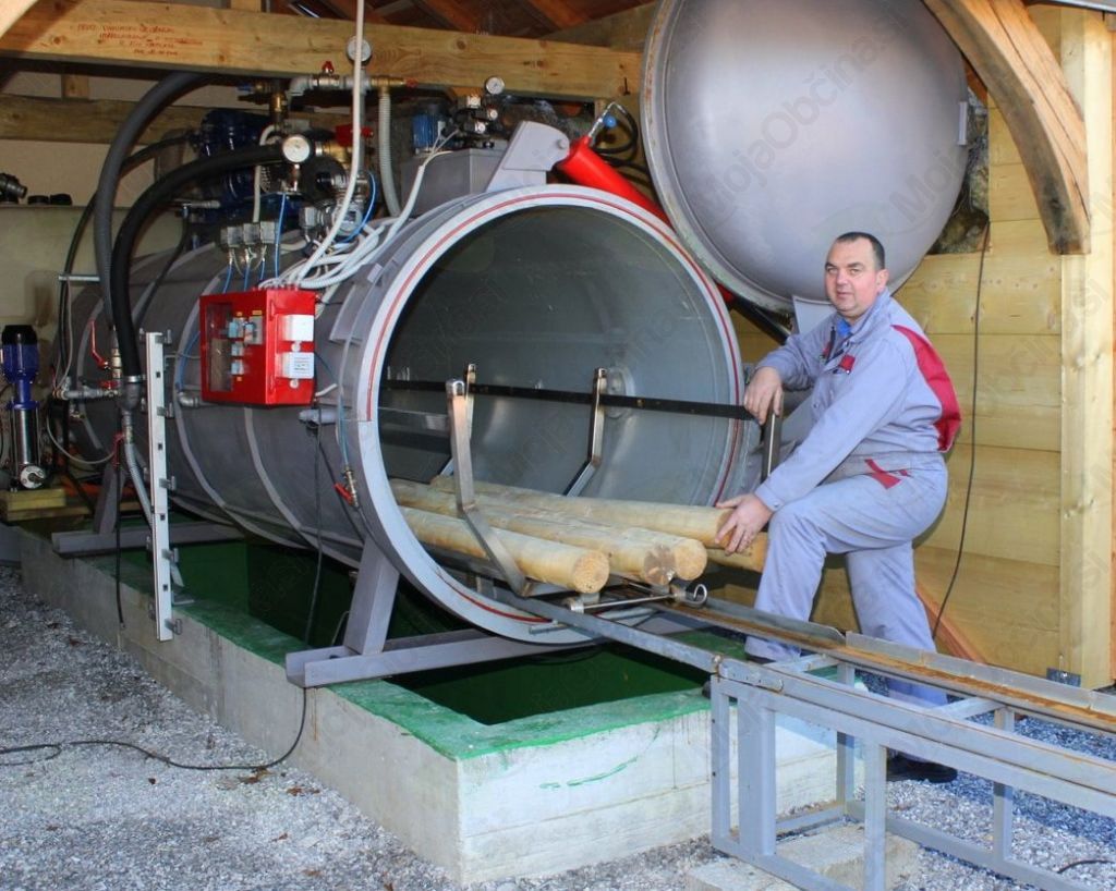 V proizvodnji okroglih profilov – okroglic se lesena debla najprej »ošilijo« na posebni stružnici, kjer se noži vrtijo okoli debla in ga stružijo na izbrani premer. Njihov stroj omogoča izdelavo okroglic od premera 3 do 35 cm. Nato je na vrsti zlaganje lesa na palete s posebnimi plastičnimi distančniki, da se les dobro posuši, in ko je suh, je pripravljen za globinsko impregnacijo, zaščito pred gnitjem, glivami in škodljivci. Les se po tirnicah zapelje v visokotlačno jekleno komoro, ki sprejme največ 4 kubične metre obdelanega lesa poljubnih premerov in dimenzij. Največja dolžina lesa je 4,1 metra. Komora se nato nepredušno zapre in električna črpalka izsesa zrak ter tako ustvari podtlak 0,8 bara, ki odpira lesne celice. Po eni uri se podtlak sprosti in začne se črpanje impregnacijske tekočine iz spodnjega betonskega bazena do vrha komore, nakar se s tretjo in glavno visokotlačno črpalko ustvari pritisk do deset barov, ki se ohranja približno pet ur, v tem času pa kubik lesa (prostornina 1000 litrov) posrka vase od 280 do 350 litrov impregnacijske tekočine, pač odvisno od debeline in gostote lesa. Ravno nadtlak povzroči veliko vpojnost lesa in s tem veliko globljo ter dolgotrajnejšo zaščito pred atmosferskimi vplivi. Smrekov les tako na prostem zdrži nekajkrat dlje, tudi 25 let brez dodatne zaščite. Uporabljajo le Silvanolin impregnacijo, ki jo proizvajajo v Ljubljani in ima vse potrebne certifikate slovenskih in evropskih inštitucij. Je tudi edini proizvod za zaščito lesa s tako širokim spektrom delovanja in hkrati okolju prijazen, zato je tudi patentno zaščiten v EU, ZDA, Rusiji in Avstraliji. Silvanolin se posuši in veže v les v 48 urah, naknadno ni več vodotopen in izperljiv. Kontrola kvalitete zaščite impregniranih lesnih elementov je stalna in se izvaja na Biotehniški fakulteti.
