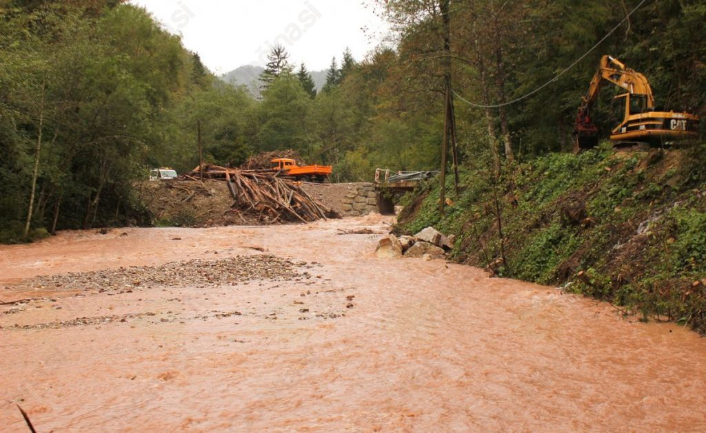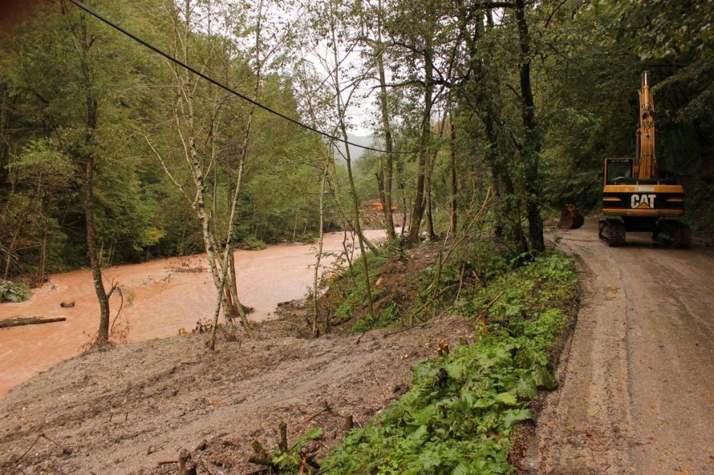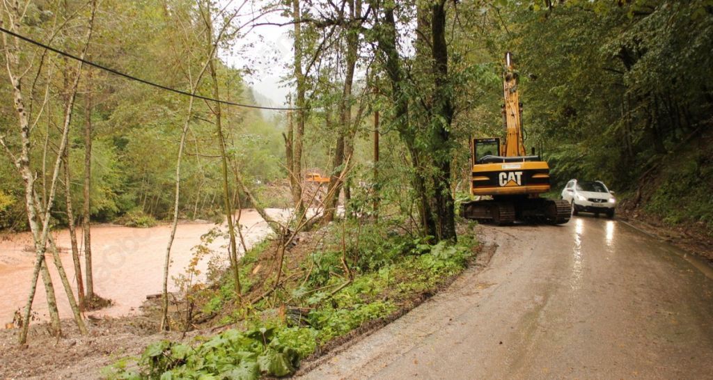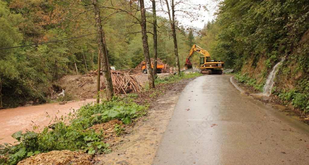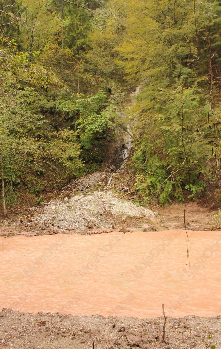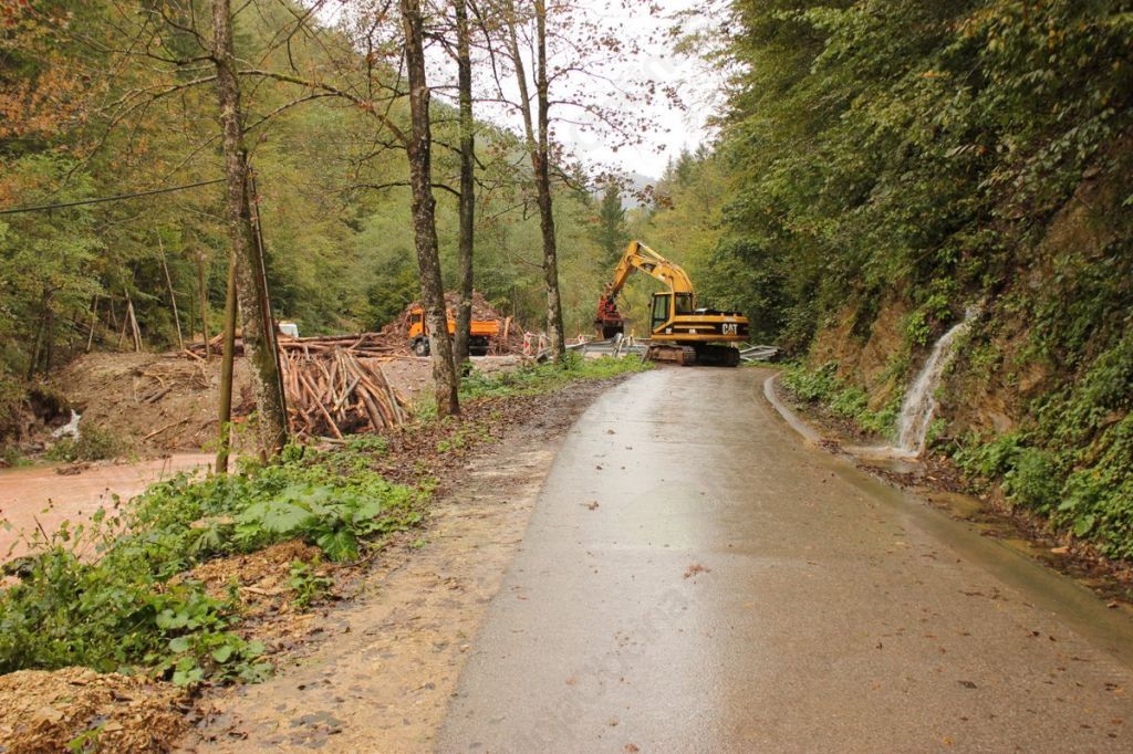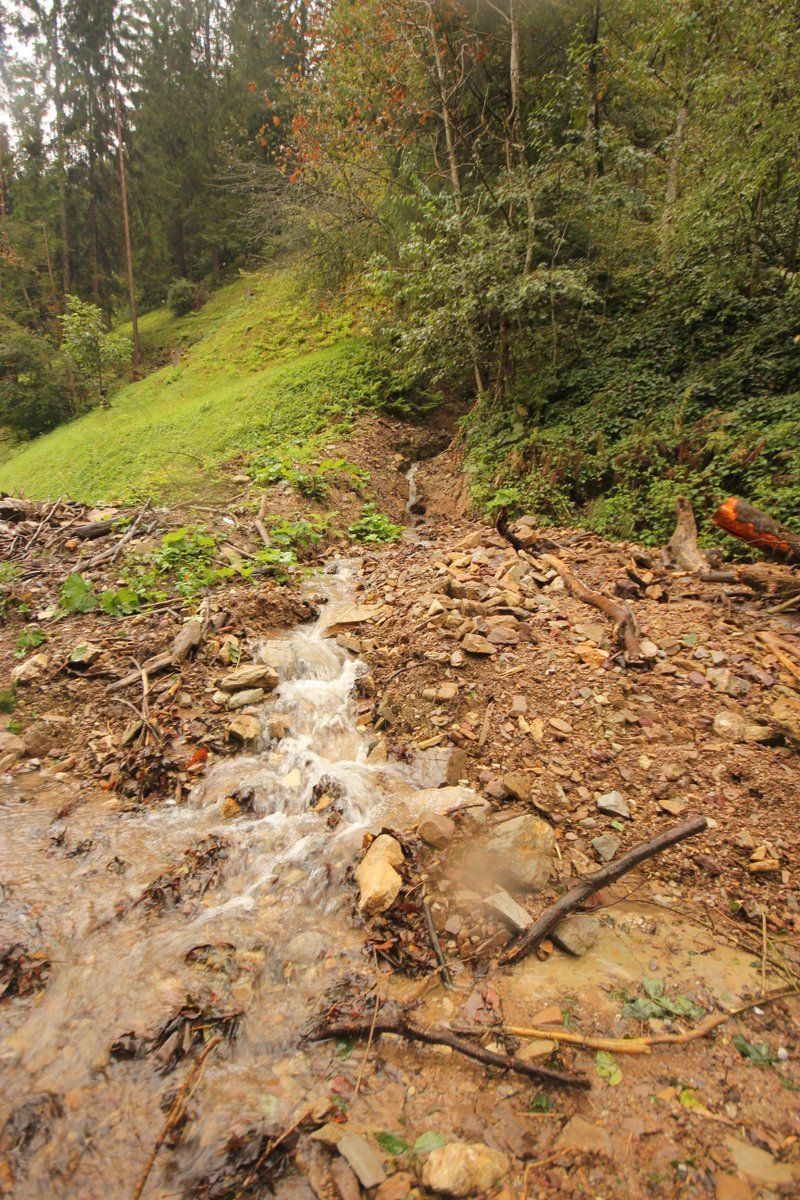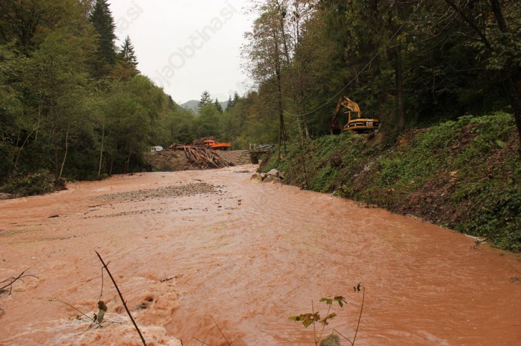 Malo nižje in še malo pred vzdrževalci je bil na terenu goseničar družbe Hidrotehnik, ki je iz narasle vode odstranjeval zataknjena debla in štore. Malo višje zagledam drevo, podrto prek struge kot naravni most, v strugi pa kar nekaj štorov, ki jih prej ni bilo. In povsem desno zagledam betonsko cev premera 60 cm, ki je nekje višje služila za vodni kanal pod cesto ... Poudarek je na pretekliku, kajti sedanjost je ... katastrofa!