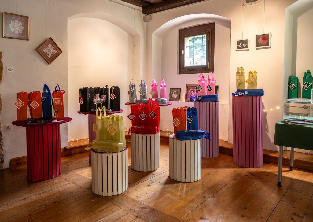 Pripis k fotografiji: S čipkami okrašene darilne vrečke na razstavi Čipka in okus časa. Foto: Mirjam Gremes.