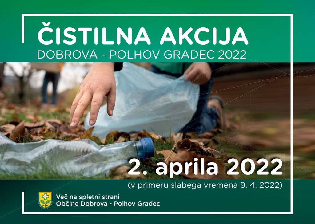 Vabimo vas, da se nam pridružite na čistilni akciji in s svojo udeležbo prispevate k čistejši in lepši občini Dobrova - Polhov Gradec. Odpadki postajajo vse večji okoljski problem, ki ga kot posamezniki lahko rešujemo že na vsakodnevni ravni, kot skupnost pa svoj delček prispevamo na občinski čistilni akciji. Letošnja bo potekala v soboto, 2. aprila 2022, s pričetkom ob 9. uri na navedenih zbirnih mestih (v primeru slabega vremena pa teden kasneje, torej v soboto, 9. aprila 2022).