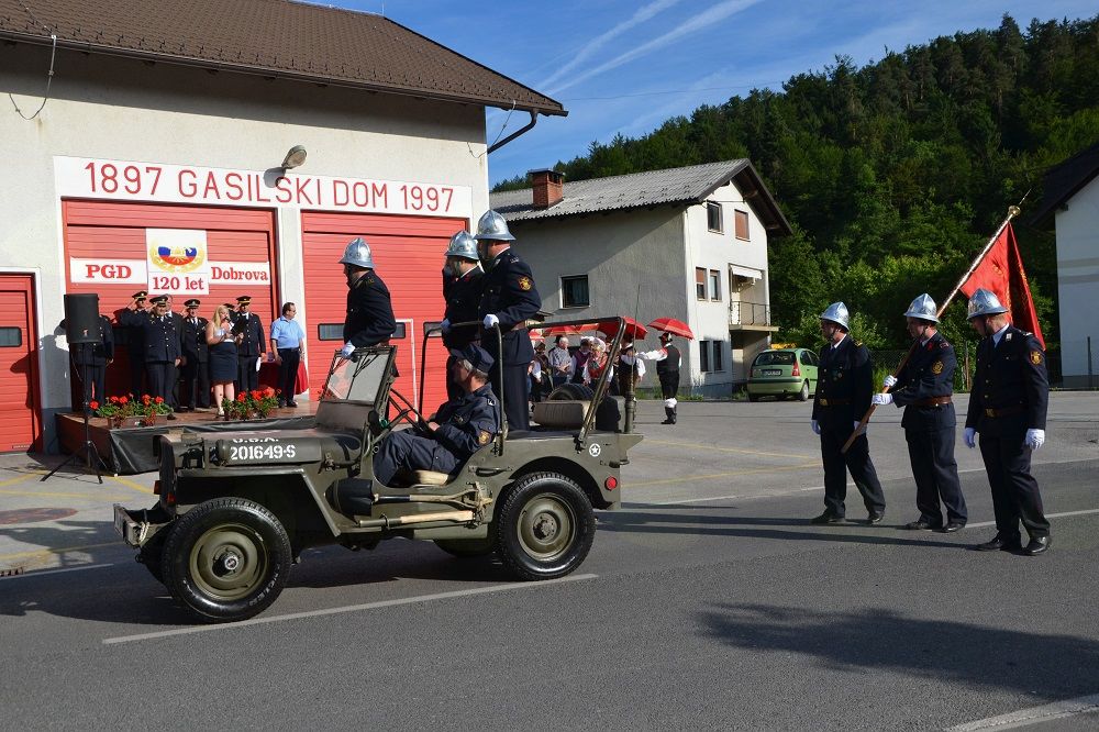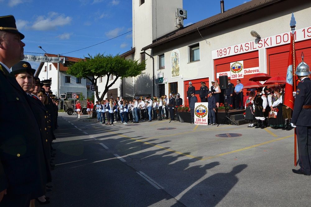Praznovanje okroglega jubileja se je začelo s slovesno povorko, v kateri so sodelovali domači gasilci in gasilci drugih društev iz Gasilske zveze Dolomiti, GZ Horjul in pobratenih društev, horjulske mažorete, narodne noše, lovci, konjeniki, gasilska mladina, praporščaki ter šoferji z gasilskimi vozili. Slovesnemu mimohodu ob spremljavi Godbe Dobrova - Polhov Gradec so poleg obiskovalcev prisostvovali tudi častni gostje, med katerimi so bili predstavnik Gasilske zveze Slovenije Franc Bradeško, župan Franc Setnikar, predsednik KS Dobrova Marjan Pograjc, predsednik GZ Dobrova Marjan Peklaj, poveljnik GZ Dolomiti Filip Božnar, predsednik GZ Horjul Ladislav Prebil in še nekateri drugi. Po pozdravu je uvodni nagovor je pripadel tamkajšnjemu predsedniku PGD Dobrova Petru Otorepcu, ki je zbranim predstavil 120-letno zgodovino društva.