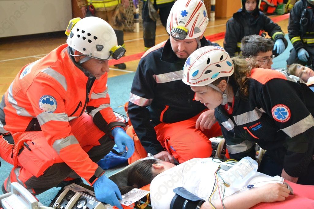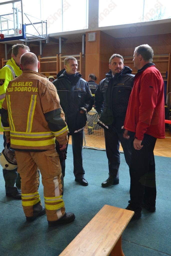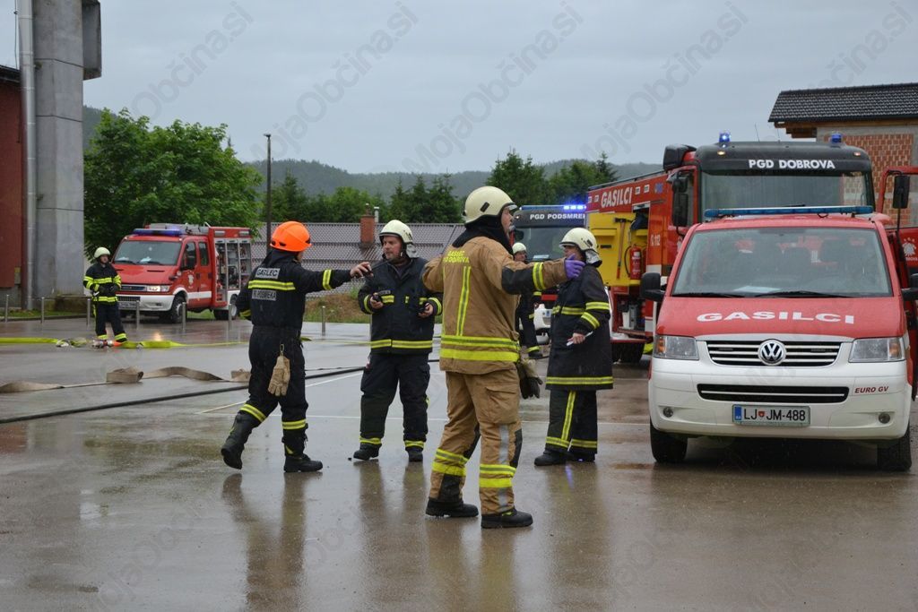 Prvi so na prizorišče prišli domači gasilci PGD Dobrova, za njimi pa so se glede na oddaljenost razvrstila še preostala gasilska društva, ki delujejo v okviru GZ Dolomiti – PGD Podsmreka, PGD Brezje, PGD Hruševo, PGD Dvor, PGD Polhov Gradec, PGD Zalog, PGD Šentjošt, PGD Butajnova – Planina in PGD Črni vrh; skupaj 96 prostovoljnih gasilcev in 16 gasilskih vozil. Nekateri so si nadeli maske, priključene na jeklenke, in začeli raziskovati prostore šole ter iz njih prinašati ponesrečence, drugi so skrbeli za varno požarno okolje. Pri delu so jim pomagali tudi dva pripadnika Gasilske brigade Ljubljana ter dež, ki je poskrbel, da se požar ni širil. Ponesrečencem so bolničarji in enota civilne zaščite nudili prvo pomoč. Po prihodu reševalnih vozil, ki so na kraj dogodka prihajala iz različnih zdravstvenih domov, in sicer Ljubljana, Litija, Kamnik, Logatec in Ribnica, so ponesrečence v celoti oskrbeli zdravniki ter usposobljeno zdravstveno osebje. Ponesrečenci so bili, glede na triažo zdravnika, razdeljeni v različne barvne skupine – zelena, rumena, rdeča, črna – glede na poškodbe. Prav vsak od 56 ujetih oziroma ponesrečenih je bil deležen ustrezne zdravstvene nege, nekateri so bili celo odnešeni v reševalna vozila in odpeljani na varno.