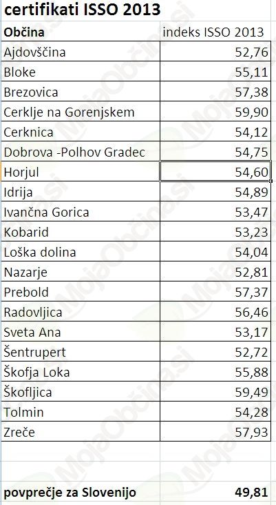 Za pridobitev letošnjega certifikata so se morale občine uvrstiti v tako imenovani prvi kvartil: torej med 25 odstotkov občin z najugodnejšimi vrednostmi indeksa ISSO. Gre za sestavljeni indeks, ki meri doseženo stopnjo razvitosti občine. Sestavlja ga 43 kazalnikov, izvedenih iz statističnih, finančnih in gospodarskih podatkov o občini. Indeks zajema demografska gibanja, učinkovitost delovanja občine, dinamiko gospodarskega razvoja, stanje na trgu dela in na področju izobrazbe, življenjski standard, stopnjo socialne kohezije in stopnjo okoljske ozaveščenosti v občini.