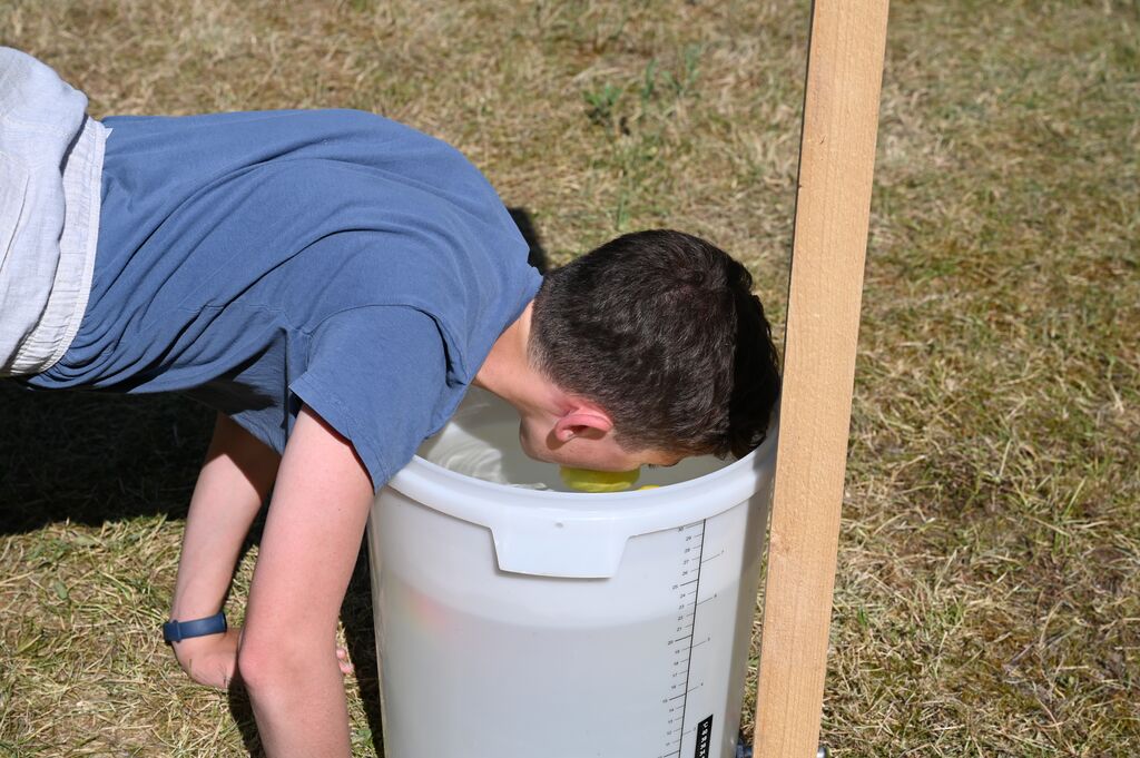 prebiti na drugo stran in z usti zagrabiti enega izmed jabolk, ki so plavali v