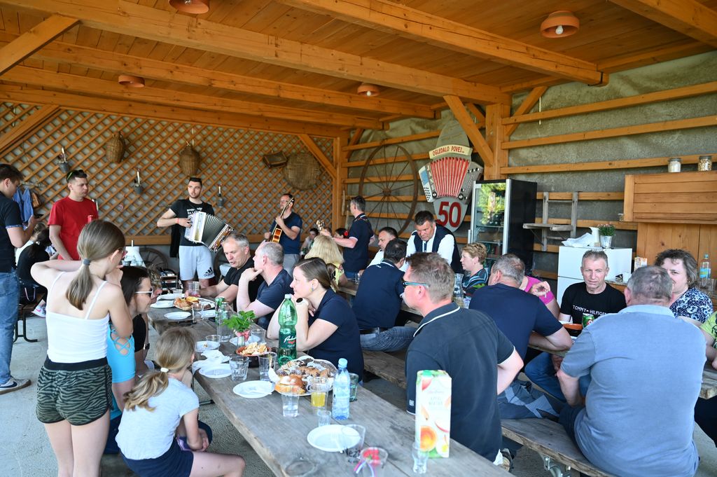 Po vsem lepem pa smo se godbeniki veselo odpravili še na privat zabavo k našemu mecenu Janetu na Komanijo, kjer že vseh 10 let zaključujemo naše Prvomajske budnice. Najprej nas postrežejo z okusnimi jedmi z žara, nadaljujejo pa s sladkimi dobrotami ob spremljavi odlične slovenske glasbe. Naša končna postaja ni le privat godbeno druženje, vendar tudi druženje glasbenikov, prijateljev in znancev ob dobri glasbi. Letos ob 10. obletnici pa so nas še posebej presenetili, saj so nam podarili torto s pentljo v barvah godbe z napisom 10 let godbe pod kozolcem. Iskrena hvala družini Jarc za vso požrtvovalno delo vsak prvi maj, ko nas tako prijazno gostite z vsem možnim – od izvrstne in raznolike hrane in vse tja do glasbe in druženja. Kot se spodobi, smo na druženju ostali še do večernih ur.