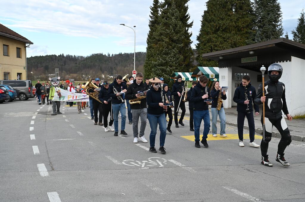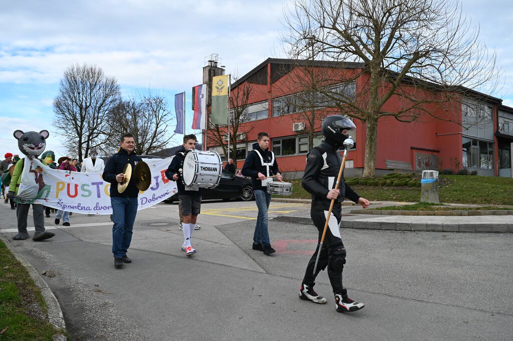 Pustovanje je otvorila Godba Dobrova - Polhov Gradec s tradicionalno povorko po Dobrovi, ki je poskrbela za slovesen in vesel začetek dogodka. Tokrat je maškare in godbo končno pričakalo lepo vreme. Zbrane maškare in obiskovalci so ob spremljavi godbe po paradi napolnili dvorano ter pričarali pravo živahno, pisano vzdušje.