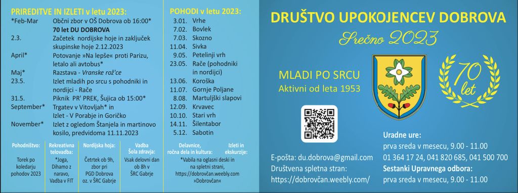 Veselimo se novih srečanj in aktivnosti! Prisrčno vabimo k vpisu nove članice in člane. Obiščite našo spletno stran »Dobrovčan« https://dobrovčan.weebly.com/, pišite nam na du.dobrova@gmail.com ali pa pokličite Antona na 041 820 685 in Jelko na 041 500 700.