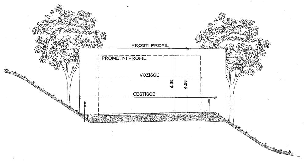 • - da morajo biti drevesa, ki rastejo ob omenjenih cestah, obrezana tako, da je prosta višina nad cesto najmanj 4,5 m (slika);