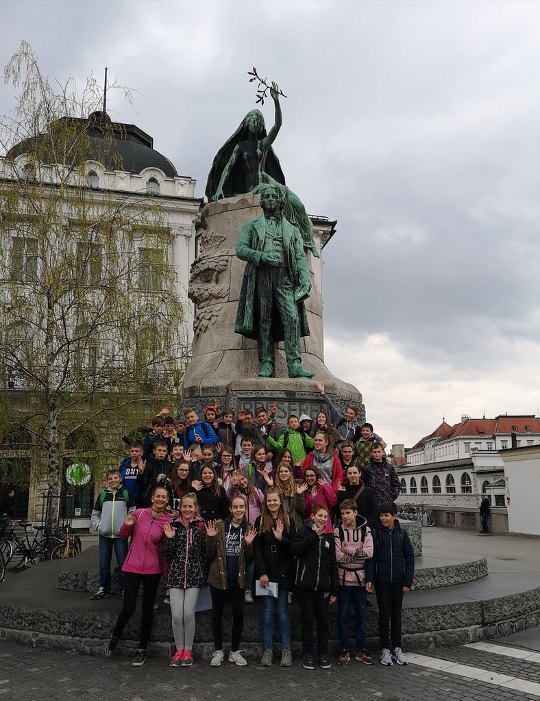 V četrtek, 4. aprila, smo se sedmošolci v okviru projekta Rastem s knjigo podali v našo prestolnico Ljubljano. Kot se spodobi za projekt, ki je povezan s knjigami, smo si najprej ogledali knjižnico, in sicer knjižnico Prežihovega Voranca. Že na zunaj je zanimiva, v notranjosti pa je še toliko lepša, saj ji dodatno lepoto prinesejo knjige. Poslušali smo zanimivo predstavitev in si nato tudi ogledali posamezne prostore v njej. Najbolj me je presenetila študentska soba, kjer imajo šolarji, dijaki in študenti možnost branja in delanja seminarskih nalog v miru. Ob odhodu iz knjižnice smo dobili vsak svoj izvod knjige Avtobus ob treh. Sledil je ogled Kongresnega trga. Je zelo velik, obdajajo ga zanimive stare zgradbe in seveda pogled na Ljubljanski grad. Nato smo si ogledali maketo Ljubljane. Potem smo se odpravili do znamenitega Prešernovega trga, ki ga krasi veličasten spomenik našemu največjemu pesniku Francetu Prešernu z muzo, boginjo umetnosti, ki bdi nad njim. Tam so nam sošolci predstavili zgodovino kipa. Zanimivo se nam je zdelo, da je ob razkritju kipa nastal škandal zaradi odkritega oprsja muze in da nekateri verjamejo, da pogled na muzo prinese navdih. Od makete smo zavili proti Tromostovju, ki na domiseln trojni način prečka reko Ljubljanico. Tam smo izvedeli veliko novega o znanem arhitektu Jožetu Plečniku, ki je tudi zaslužen za videz mostu. Hodili smo tudi po Mestnem trgu. Ogledali smo si Robbov vodnjak in poslušali predstavitev naših sošolcev. Predstavili so nam tudi Magistrat, ki je pomemben del trga. Sledil je še najmanjši, Ribji trg. Ime je dobil po ribiškem pristanu in ribji tržnici. Najpomembnejši objekt na trgu je tako imenovana Polževa hiša, v kateri je bival Primož Trubar. Nato smo si ogledali že vsem iz pesmi poznan Šuštarski ali Čevljarski most. Zanimivo se nam je zdelo, da so pod njim včasih kaznovali peke, ki so goljufali pri tehtanju kruha. Zaprli so jih v leseno košaro in jih namakali v Ljubljanico. Pred odhodom domov smo šli še mimo največje knjižnice v Sloveniji, Narodne in univerzitetne knjižnice, ki je še danes lep spomin na našega arhitekta Jožeta Plečnika. Vsem nam je bila všeč zanimivo oblikovana vratna kljuka v obliki konja. Tako se je naš ogled Ljubljane končal in avtobus nas je odpeljal nazaj proti šoli. Vsi smo že komaj čakali, da preverimo, ali nam je knjiga, ki so nam jo podarili, všeč.