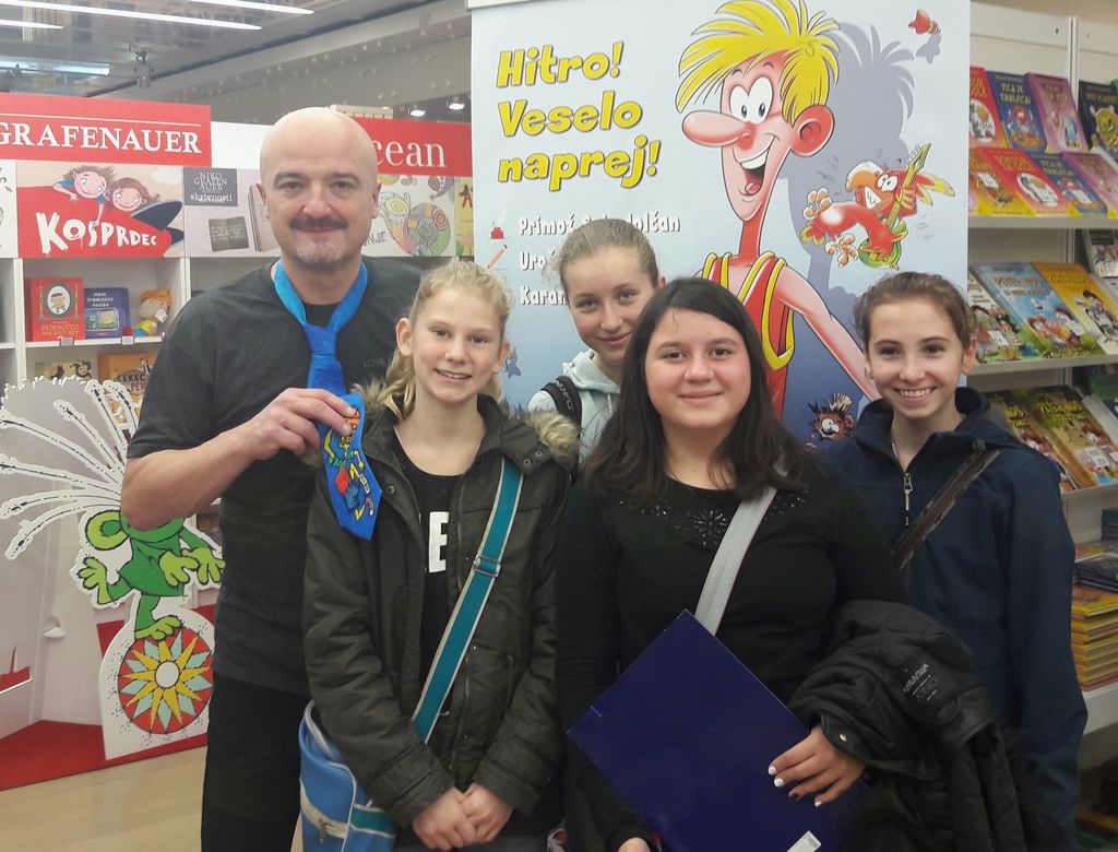 Tudi letos smo se z učenci izbirnega predmeta Literarni klub sedaj že tradicionalno udeležili Ljubljanskega knjižnega sejma, tokrat 32. po vrsti. Takoj ko smo odprli vrata Cankarjevega doma, nas je živžav sejma popolnoma prevzel in posrkal v knjižno dogajanje. Udeležili smo se različnih zanimivih dogodkov. Najbolj smo se razveselili pogovora s pisateljem Primožem Suhodolčanom in ilustratorjem njegovih knjig Urošem Horvatom ter našo smučarsko junakinjo Tino Maze, o kateri je avtor številnih mladinskih knjižnih uspešnic Primož Suhodolčan napisal, kot pravi Tina Maze, resnično pravljico o njenem smučanju z naslovom Tina in medvedja moč. Prisluhnili smo glavni junakinji knjige, ki nam je prebrala odlomek iz omenjene slikanice. Na sejmu smo poslušali tudi intervju z literarnim ustvarjalcem Vinkom Möderndorferjem, se udeležili debatne kavarne s prevajalko in voditeljico Blažko Müller Pograjc in različnimi jezikoslovci ter profesorji književnosti. Z zanimanjem smo se prepustili tudi resnično bogatemu knjižnemu naboru različnih knjižnih založb. Učenci so s pomočjo pripravljenih zanimivih nalog raziskovali sejem, pri čemer so bili zelo uspešni. Preživeli smo poseben, nadvse zanimiv in z različnimi dogodki napolnjen dan.