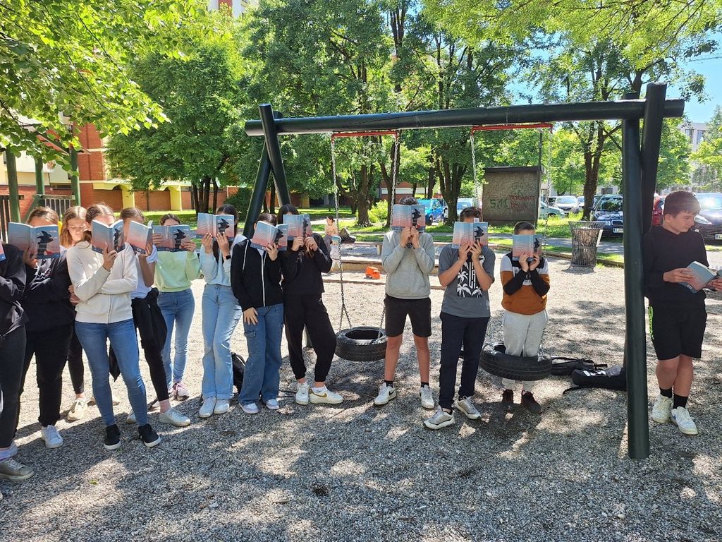 Po obisku so si na bližnjem igrišču temeljito ogledali podarjeno knjigo, v