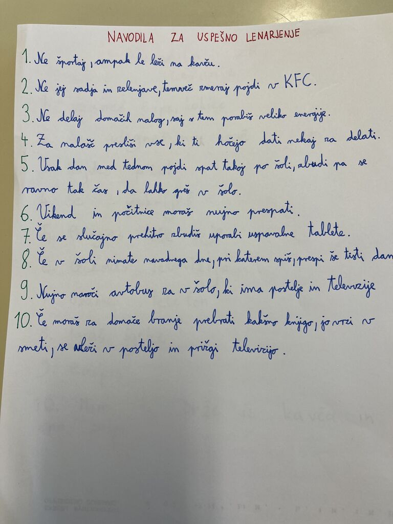 Učenci v prvi triadi so se zabavali s šalami. Za domačo nalogo so morali povprašati starše, o zabavnih dogodivščinah. Z nalogo so se zabavali, spoznavali starše in se tudi povezovali z družinskimi člani, saj so nekateri prenesli nalogo tudi na stare starše, ki jim pisanje z roko prav tako pomaga trenirati možgane.