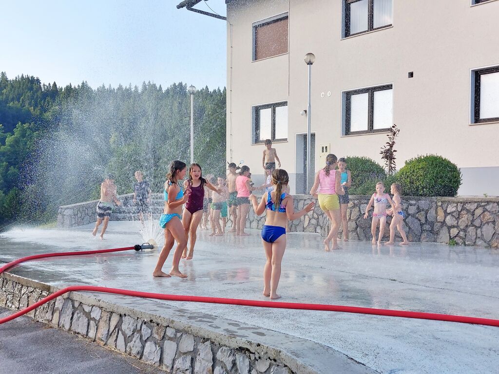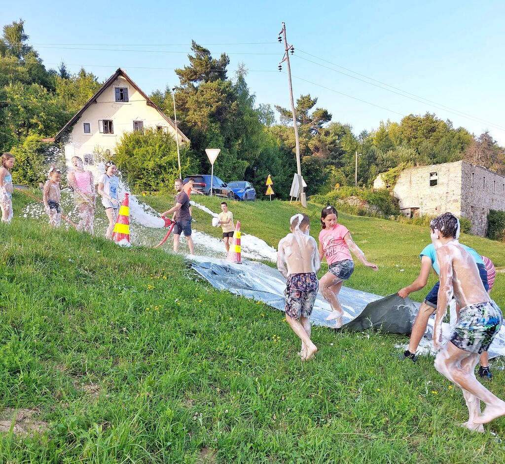 V torek, 24. 6. 2025, na zadnji šolski dan smo otrokom Črnega Vrha in okolice člani gasilskega in kulturnega društva polepšali zaključek šolskega leta. Druženje smo začeli v popoldanskih urah, ko nas je še prijetno grelo sonce. Najprej z vodnimi igrami, kjer so se otroci škropili, ciljali z vodnimi baloni, igrali s peno in žogicami ter se spuščali po vodni drči. Veselje in smeh otrok se je slišalo daleč naokoli. V večernih urah smo druženje popestrili s poslikavo obrazov, hrbtov in rok, za katero je poskrbela naša krajanka Lidija Plestenjak. Povabili smo tudi frizerko Ano, ki je v svojem kotičku poskrbela za izdelovanje najrazličnejših frizur na glavah naših otrok. Otroci so za spomin na druženje prejeli torbice, katere so lahko po želji še okrasili/poslikali po svoji domišljiji.