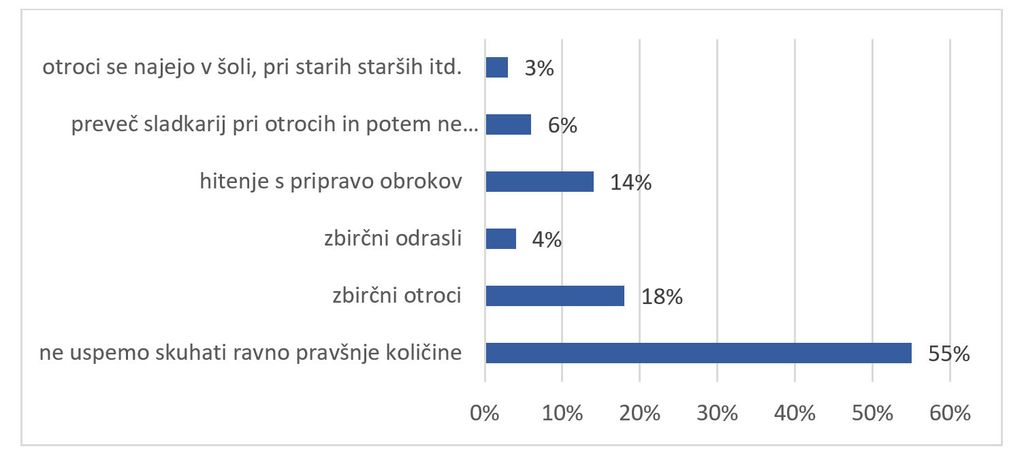 Glavni razlog za zavržke hrane je največkrat v tem, da ne uspejo skuhati pravšnje količine hrane. 18 % anketirancev meni, da so glavni razlog izbirčni otroci, 14 % anketirancev pa da hitenje pri pripravi obrokov. Vprašani zavržejo največ prilog, predvsem krompirja (45 % vprašanih), najmanj pa mesa in sladic. 70 % vprašanih več hrane zavrže med tednom kot ob koncu tedna. V prihodnje si želi zmanjšati količine zavržene hrane 91 % vprašanih, 6 % vprašanih tega ne želi, 3 % vprašanim pa je vseeno.
