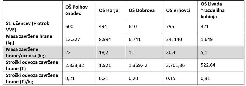 Če primerjamo količino zavržene hrane na učenca med šolami v porečju Gradaščice, opazimo največji delež pri eni od ljubljanskih osnovnih šol. Naša šola je z 22 kg/učenca na drugem mestu. Stroški odvoza so med šolami različni. Največji so pri šoli, ki ima razdelilno kuhinjo in hkrati najmanjši delež odpadne hrane na učenca, kar je posledica tega, da v odpadni hrani ni neužitnih delov živil, ki nastanejo v kuhinji.