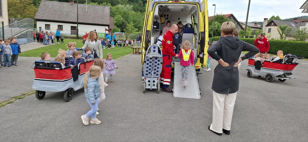 V ponedeljek, 12. maja 2025, so otroke iz vrtca pri OŠ Dobrova obiskali reševalci iz nujne medicinske pomoči. Njihov prihod je bil za najmlajše prava dogodivščina, hkrati pa dragocena priložnost za učenje o pomembnem poklicu. Otroci so si z navdušenjem ogledali reševalno vozilo in prisluhnili razlagi o tem, kako poteka pomoč v nujnih primerih. Reševalci so jim predstavili svojo opremo, pokazali, kako poteka klic na številko 112, in poudarili, kako pomembno je, da ostanemo zbrani, kadar nekdo potrebuje pomoč. Že pred časom pa so imeli otroci praktično delavnico Prva pomoč za najmlajše, ki jo izvaja Rdeči križ, kjer so lahko povijali drug drugega, poslušali srčni utrip in celo sodelovali pri "reševanju" svojih igrač. Dogodek je otroke navdušil in jim na zabaven način približal pomen pomoči, skrbi za druge ter odgovornosti, ki jo nosijo reševalci. Obisk so zaključili s skupinsko fotografijo in iskreno zahvalo gostom za njihovo delo.
