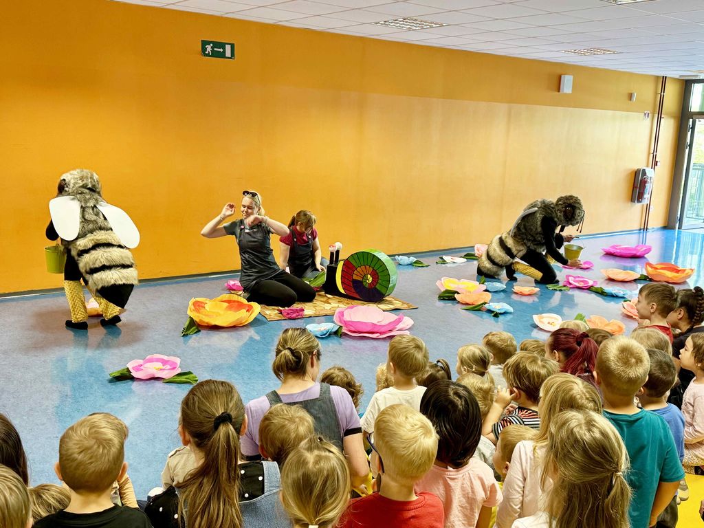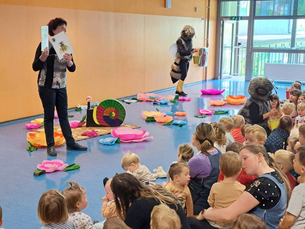 Dan smo začeli s kratko igrano igrico, kjer sta nas pozdravili "čebeli" in na oder povabili čebelarko go. Malči Božnar, ki je otrokom na prijazen in zanimiv način predstavila življenje čebel. Skozi pogovor so izvedeli, zakaj so čebele pomembne, kako nastane med in kaj pomeni biti čebelar.