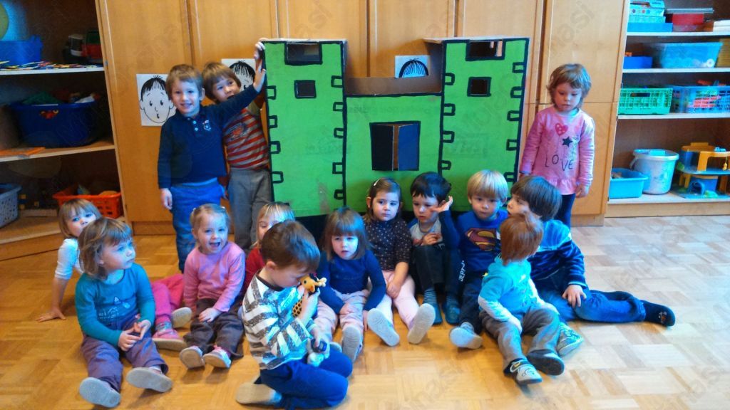 Med obiskom krajevne knjižnice na Dobrovi smo našli slikanico Gradovi. Prelistali in prebrali smo jo ter se naučili veliko novega: Kako so videti gradovi? Kdo je živel v gradu? Kdo so bili vitezi in kdo grajske gospodične? Kmalu je iz hiše nastal grad s stolpi in grajskim dvoriščem. Nekateri otroci so bili jezni, ker ni bilo več strehe. Pa ne za dolgo, saj smo prebrali glasbeno pravljico Grad gradiček in se prelevili v živali, ki so našle svoj novi dom v gradu. Glasbeno pravljico s pesmicami, instrumentalno spremljavo in gradom smo uvrstili tudi na program, s katerim smo razveselili mamice ob materinskem dnevu.