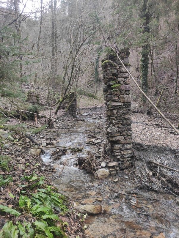 te presenetijo kamniti stebri – ostanki zgradb – najbrž mlina, ter propadajoče