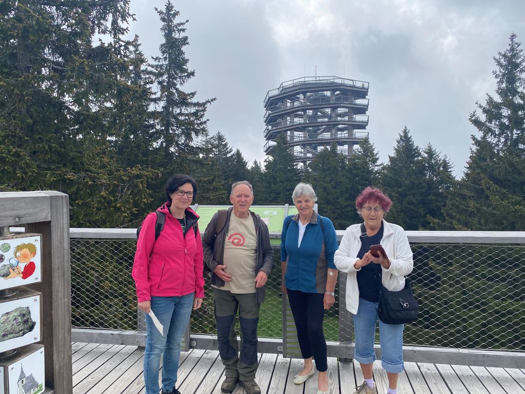 Najprej smo se odpravili na turistično kmetijo s farmo jelenov Arbajter pri vasi Skomarje na Pohorju, ki leži več kot 900 metrov visoko. V lepem okolju sta nam domačina predstavila zgodovino domačije in farmo jelenov in nas pogostila z domačimi specialitetami. Nato smo se odpeljali na Roglo in se po visoki konstrukciji sprehodili med krošnjami smrek, vse do 40 metrov visokega razglednega stolpa, ki je dostopen tudi za gibalno ovirane osebe. Na Rogli je pomladansko sonce zamenjala občasna oblačnost in veter, a vseeno smo lahko občudovali razgled vse do Slovenskih Konjic. Pot med vrhovi dreves je resnično zanimivo doživetje in mnogi smo si dejali, da bomo še prišli, mogoče z vnuki, saj je na poti veliko izobraževalno-informativnih točk za vse generacije.