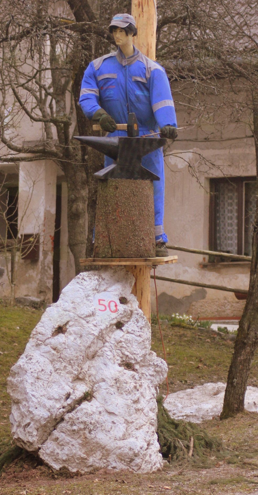 Ideja za motoriziranega kovača je prišla od bratov, pri izvedbi pa so se delu pridružili še sin, hči in drugi sorodniki. Za postavitev so bili odgovorni sodelavci, ki so si pomagali s kamionskim dvigalom. Skala ima poseben pomen, saj se rojstni hiši Francija Raztresena na Črnem Vrhu po domače reče Pri skalarju. Prav od tam je skala z zbrušeno ploskvijo, na kateri je napis 50, Franci pa še razmišlja, kam naj jo postavi za večni spomenik sebi kot mučeniku ... Franci je že 30 let priženjen na Smolnik, službuje pa pri bratu, v podjetju Agrometal na Viču. No, žena mu je v oporo in skrbi za smeh tudi ob današnjem pogovoru, ne pozabi pa na pomlad, na lastovke v hlevu, kjer imajo kar nekaj glav živine. Kot pravi, se iste lastovice vračajo k njim že leta in jih je prav vesela, saj pridno zobajo muhe, kravice pa imajo tako lepši vsakdan. Ja pa mačku na okenski polici hleva električni pastir onemogočil lov na pridne ptice … No, ljubezni in zdravja zakoncema očitno ne manjka, kar pa je za dom tako najpomembnejše.